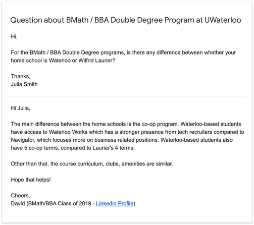 Ask a question about any university program you're curious about, and we'll connect you with an alumni from that program who can share authentic insight.